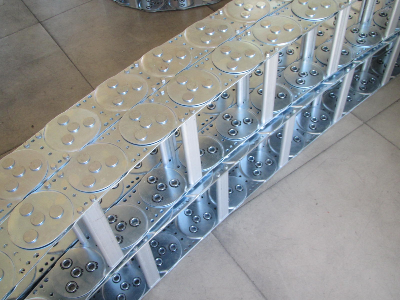 鋼鋁拖鏈的主體是由鏈板(采用優(yōu)質(zhì)鋼板經(jīng)淬火后再拋光鍍鉻/鍍鋅/噴塑處理)、支撐板(擠拉鋁合金)、軸銷(合金鋼)等部件組成,使電纜或橡膠管與拖鏈之間不產(chǎn)生扭曲變形。鏈板經(jīng)鍍鉻處理外形效果新穎,結(jié)構(gòu)合理,靈巧強度高,該產(chǎn)品鋼性好,不變形,安裝方便,使用可靠,易拆裝,不下垂,外形精美,可在較大程度上增強機床設(shè)備的整體藝術(shù)美觀效果。