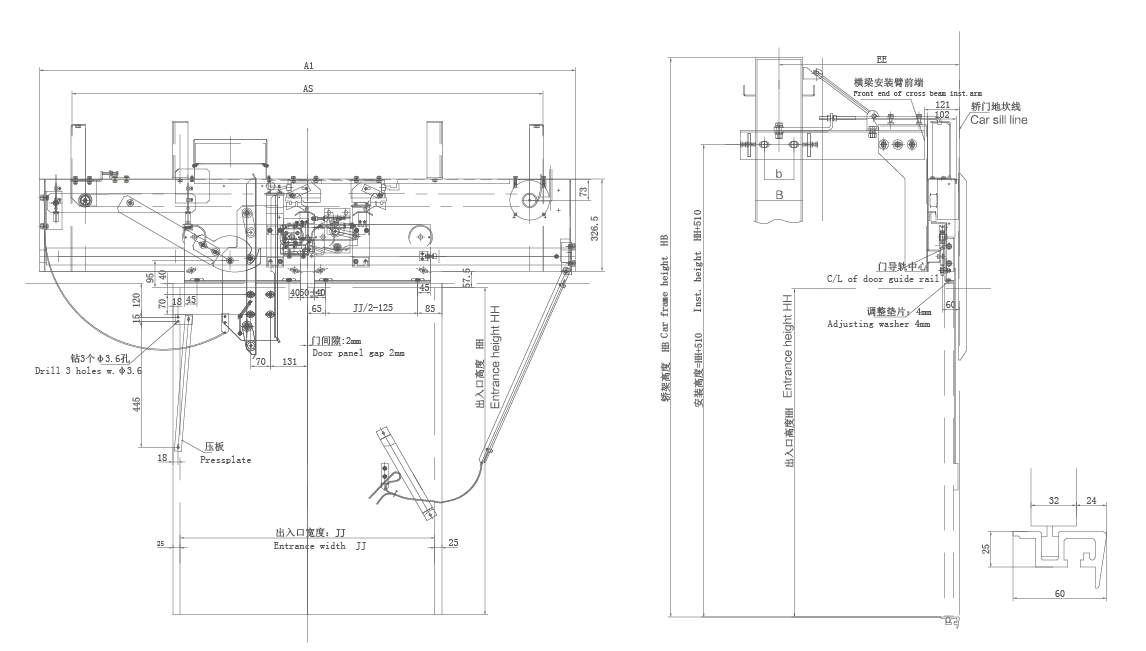 5、采用異步門刀,配轎門鎖;轎架安裝方式,適用梯速最高7m/s